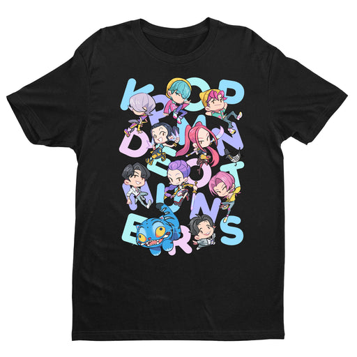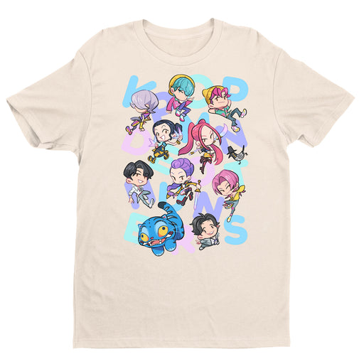 This bold graphic tee features an energetic team of chibi-style characters dancing around pastel letters. Whether you're a fan of K-pop vibes, original character art, or just love fun streetwear, this shirt adds a splash of joy to any outfit.